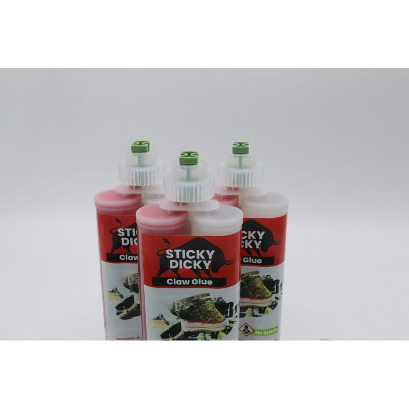 La colle à onglons STICKY DICKY est une colle nouvelle génération, double component pour pédicures bovins, éleveurs et vétérinaire. Fabriqué sans cancérogènes avec un temps de fixation compris entre 10 et 20 secondes.